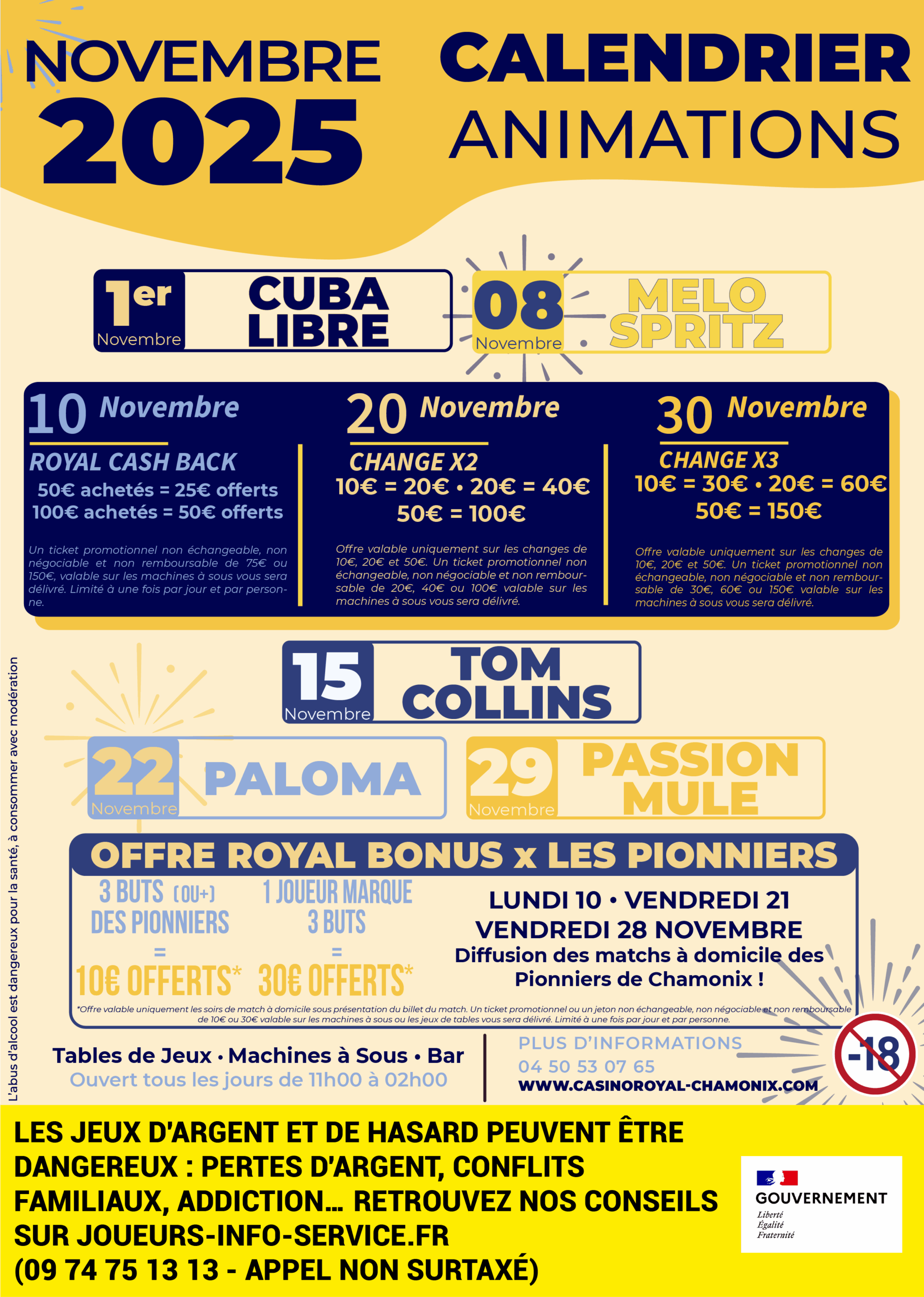 L’automne s’installe à Chamonix, et avec lui, un vent de festivités souffle sur le Casino Royal. Entre cocktails emblématiques, offres exclusives et moments de convivialité à savourer sans modération.